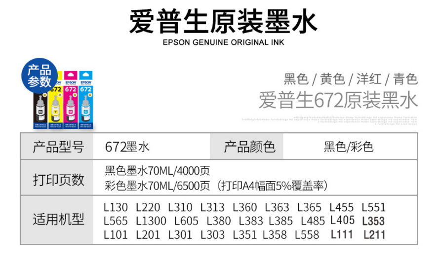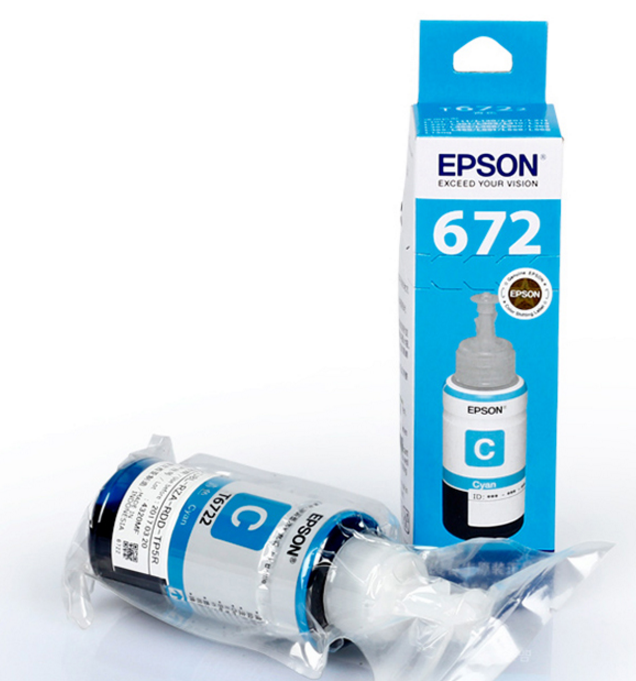 爱普生(EPSON) T6721原装墨水适用L360/L310/L1300/L380-5 墨仓式打印机墨水T672青色墨水