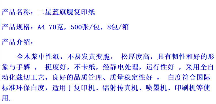 商品名称:蓝旗舰 二星 复印纸A4 70G