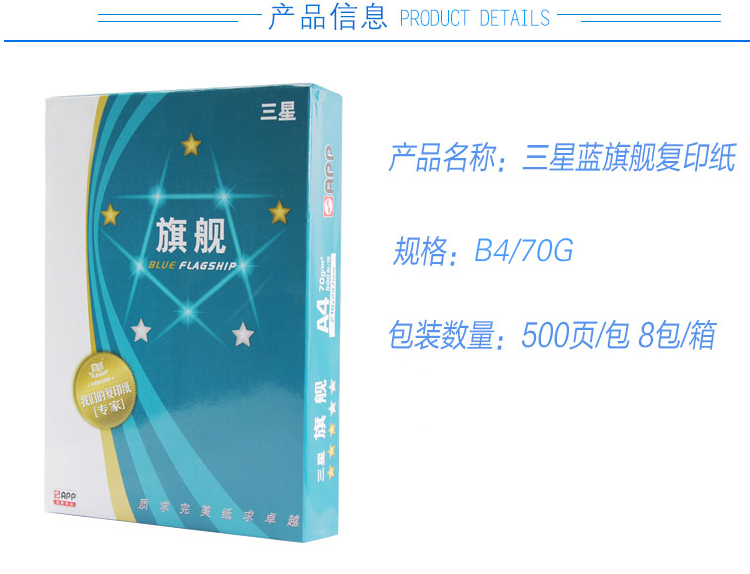商品名称:特级旗舰 B4复印纸 500张/包 8包/箱