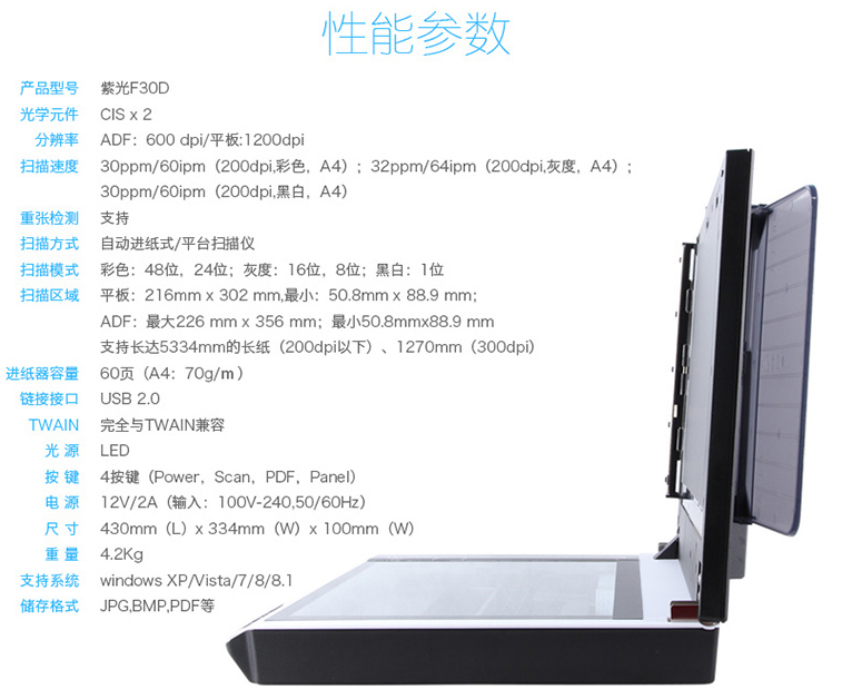 商品名称:紫光(UNIS)F30D馈纸式自动送稿高速+平板文件扫描仪