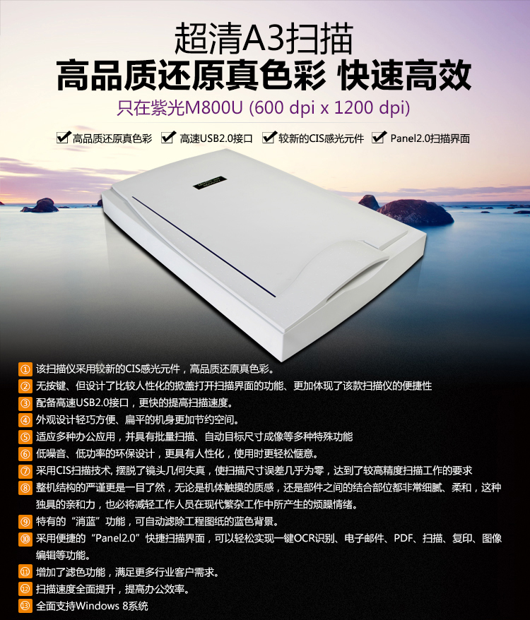 商品名称:紫光Uniscan M800U平板扫描仪