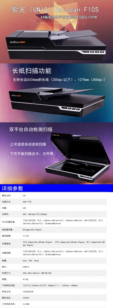 商品名称:紫光(UNIS)Uniscan F10S A4幅面馈纸平板双模式扫描仪10PPM
