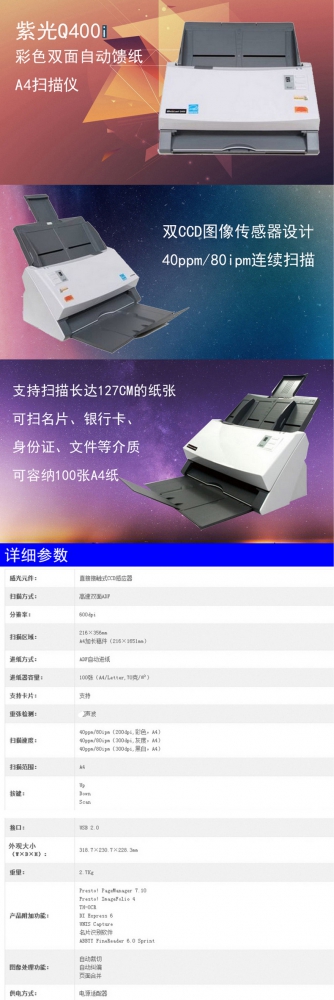 商品名称:紫光(UNIS) Q400i扫描仪A4彩色双面ADF高速扫描仪