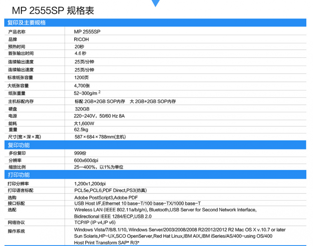 商品名称:理光 MP 2555SP黑白激光A3双面打印复印机一体机