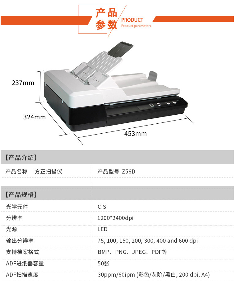 商品名称:方正(Founder)Z56D A4彩色高速双面自动进纸文档照片扫描仪