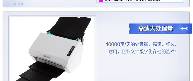 方正科技全新研发的高速文档扫描仪,具有超强的过纸能力,经久耐用的产品性能,每天扫描量可以达到6千页,具有自动裁切,自动纠偏,自动检测重张等多种功能;并且产品支持正反面同时保存不同图像格式、条码自动识别、OCR文字识别、滤色等多种特色功能,其中滤色功能可滤除文档或票据红、绿、蓝任意一种颜色。