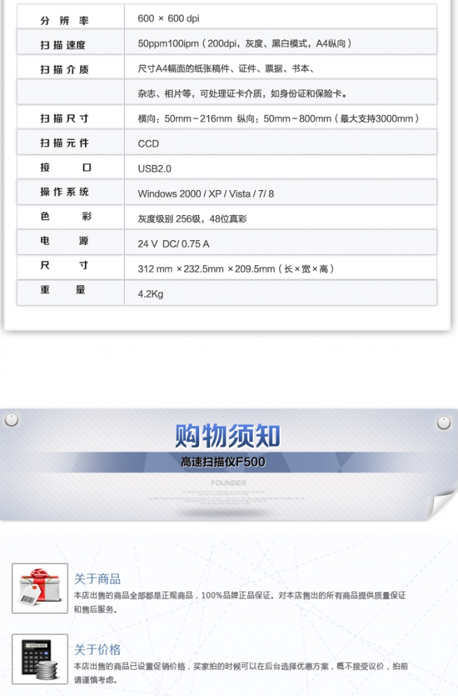 商品名称:方正(Founder)F500扫描仪A4高速双面自动进纸CCD