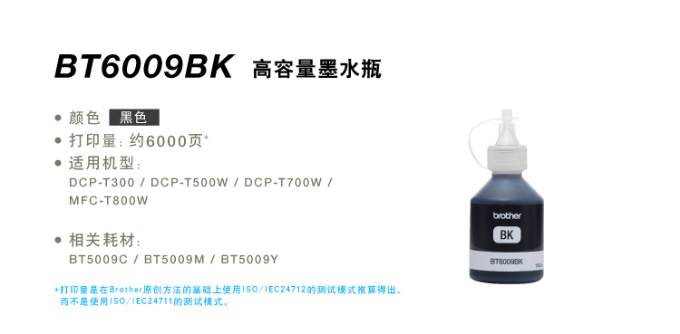 商品名称:兄弟(brother)BT6009BK 黑色墨盒(适用于兄弟打印机DCP-T500W / DCP-T300)