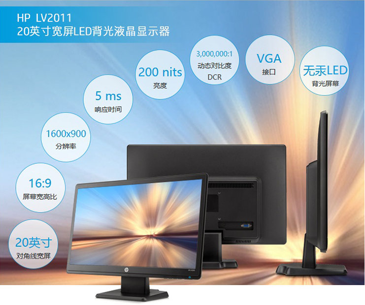 商品名称:惠普(HP) LV2011 20英寸 LED背光液晶显示器