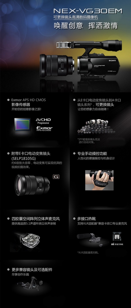 商品名称:索尼(SONY)NEX-VG30EM 可更换镜头高清数码摄像机套装 APS-C画幅 E PZ 18-105mm F4镜头