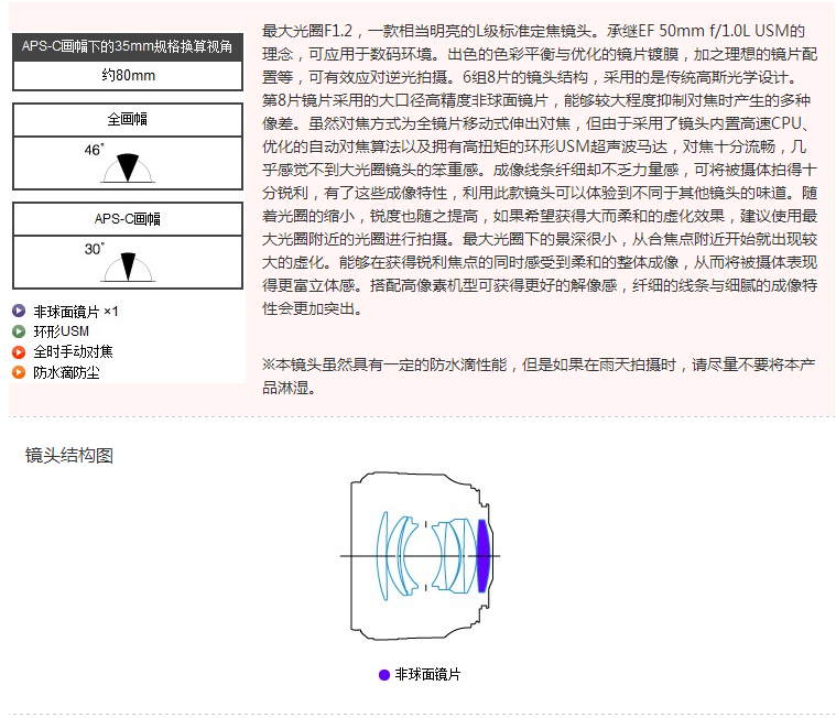 商品名称:佳能(Canon) EF 50mm f/1.2L USM 标准定焦镜头