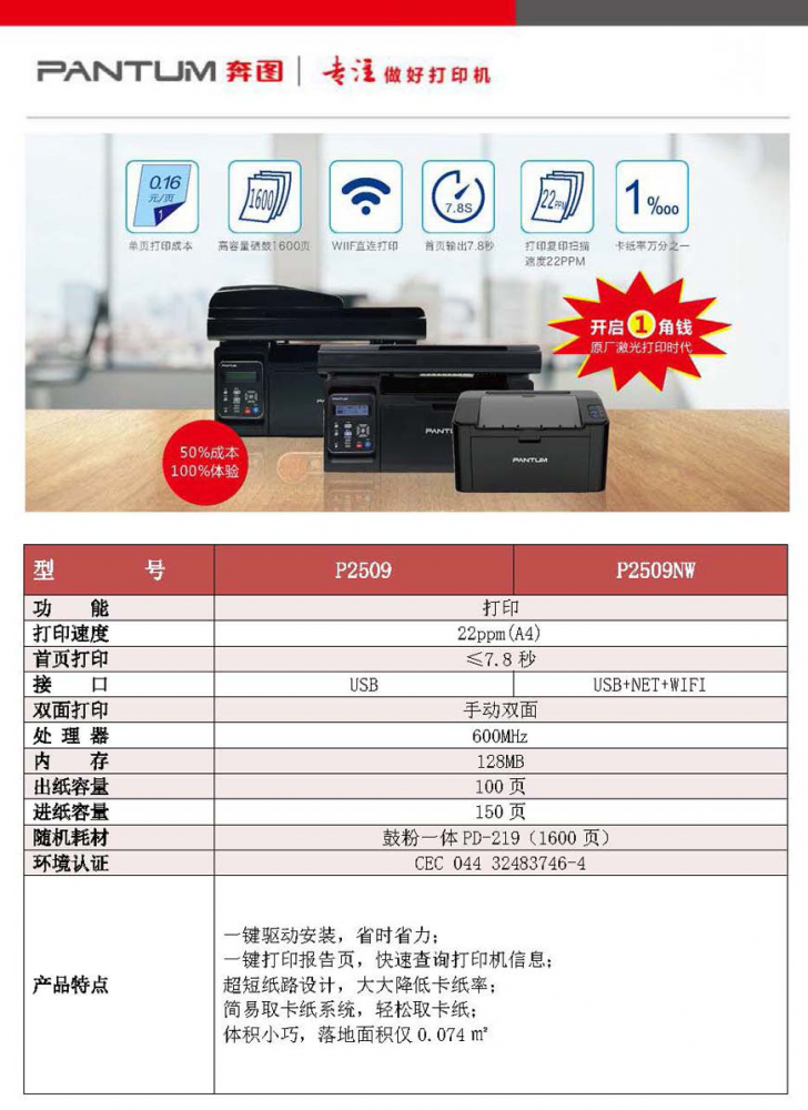 商品名称:奔图 P2509 A4 22页 黑白激光打印机