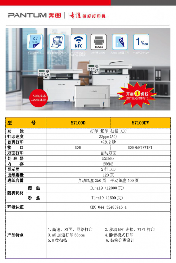 商品名称:奔图 M7109D A4 33PPM 双面 三合一