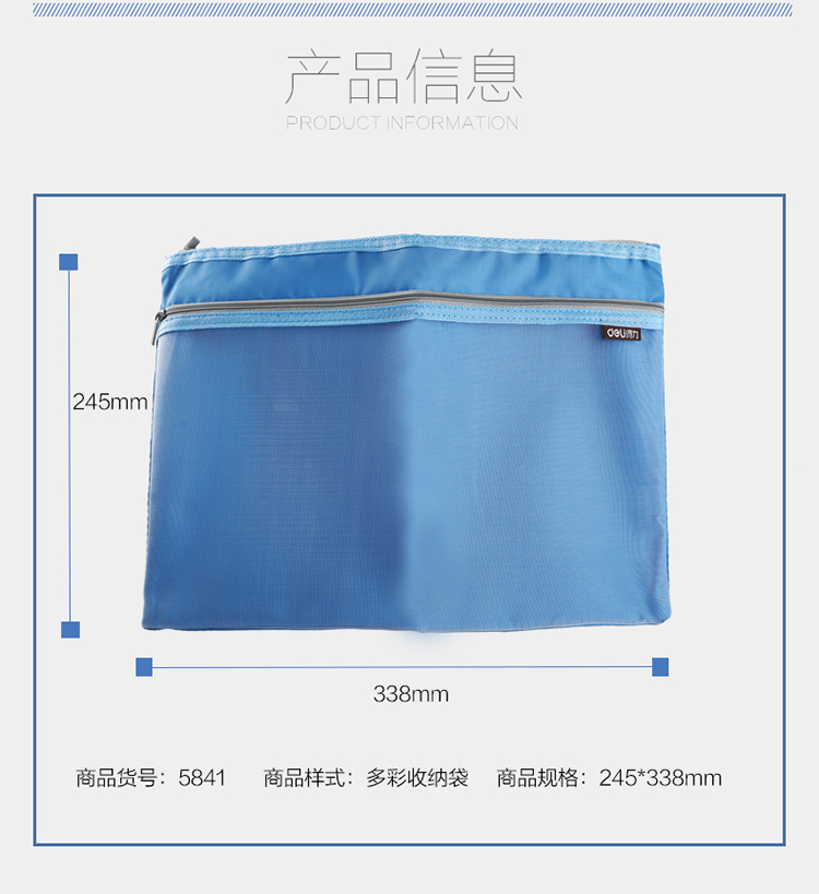 商品名称:得力 5841 透气双层柔质收纳袋 A4拉链袋 单只装