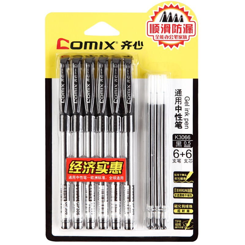 商品名称:齐心(COMIX) K3066 通用中性笔 0.5mm 6支装(6支+6芯/板) 黑