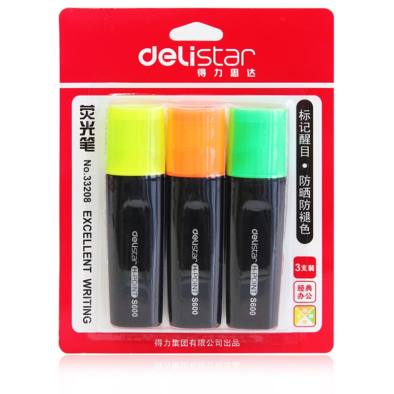 得力(deli) 33208 3色标记醒目荧光笔 水性记号笔 (橙+绿+黄)3支/卡