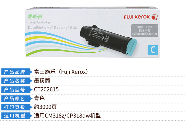 商品名称:富士施乐(Fuji Xerox)CT202615 原装青色墨粉筒 (适用CM318z/CP318dw机型) 约3000页