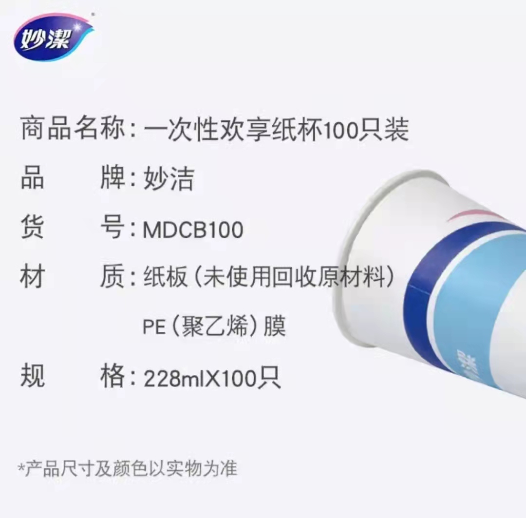商品名称:妙洁 纸杯一次性杯子 100只装228ml加厚型