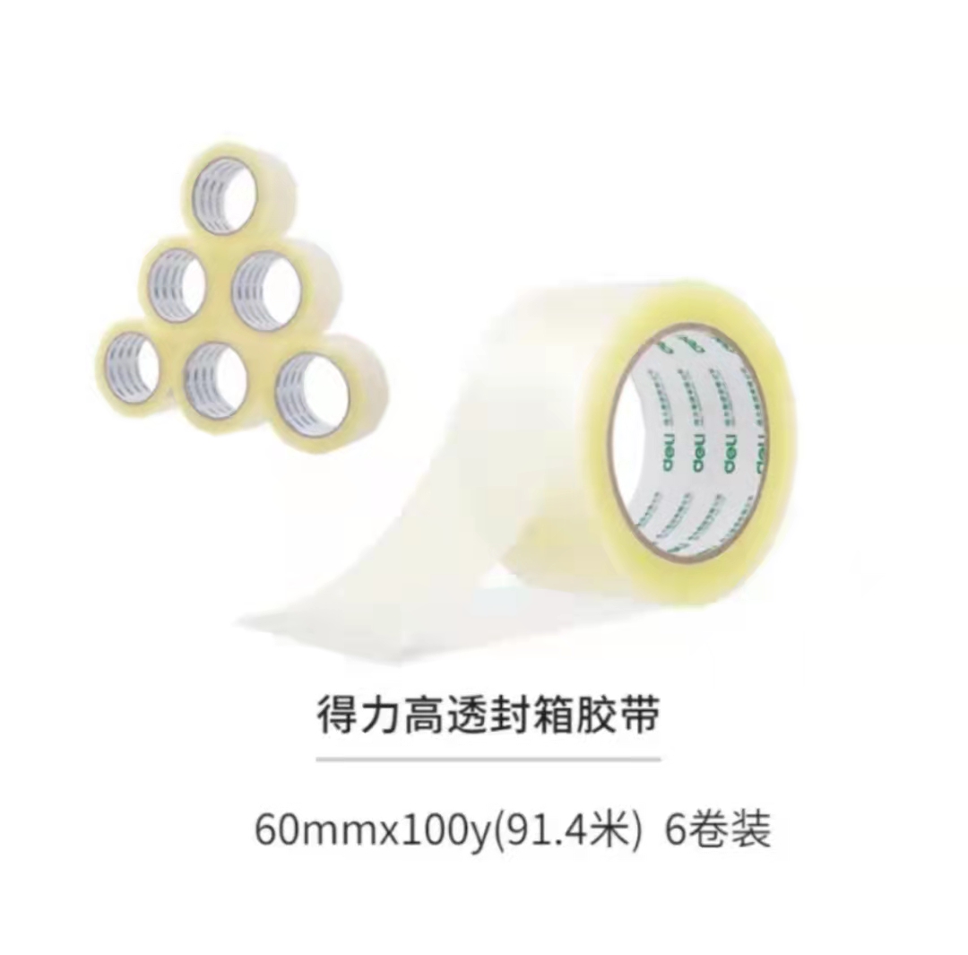 商品名称:得力(deli)高品质透明封箱胶带打包宽胶带 60mm*100y*45μm(91.4m/卷) 6卷装 办公用品 30333