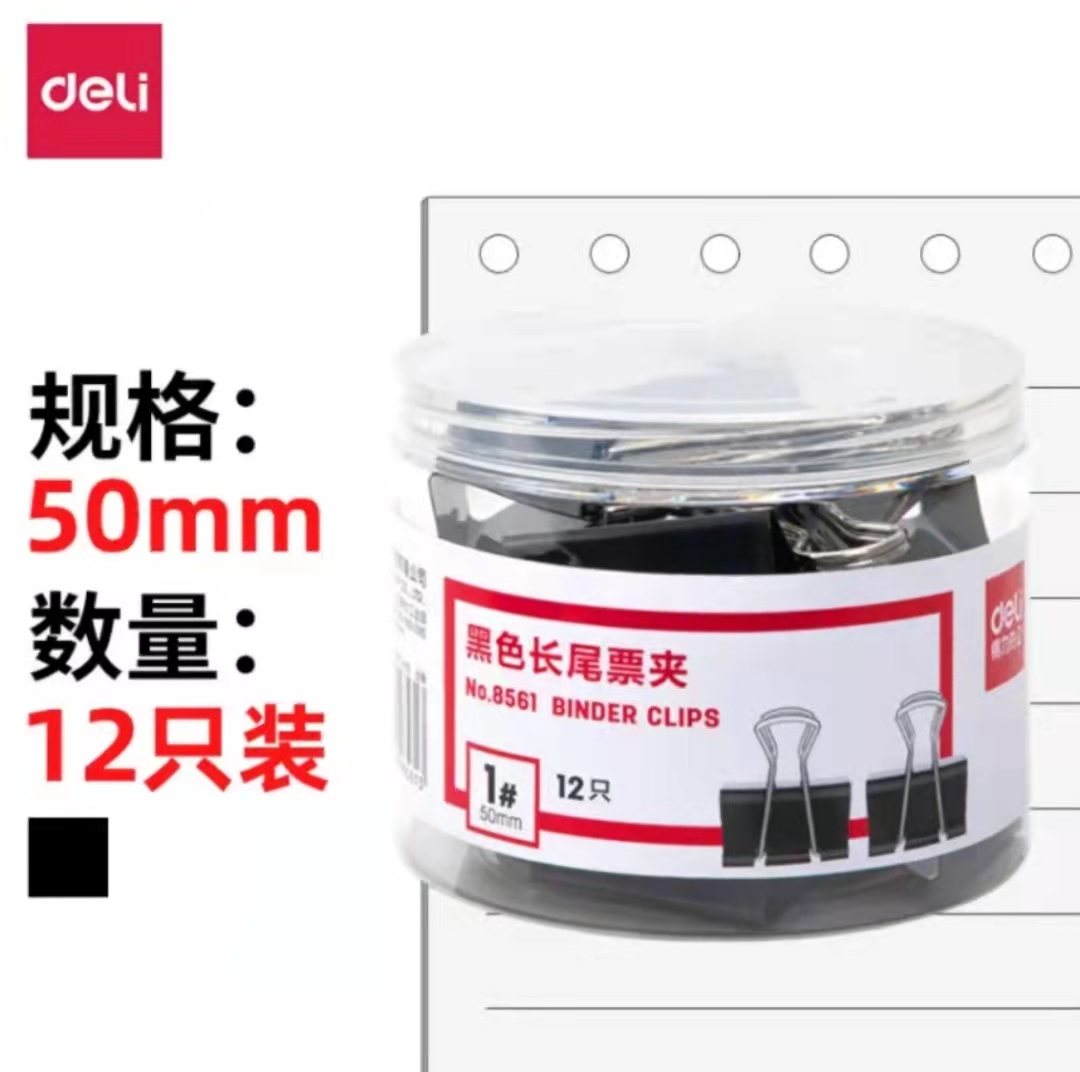 商品名称:得力(deli)12只50mm黑色长尾夹票夹 大号金属燕尾夹票据夹子 办公用品 8561