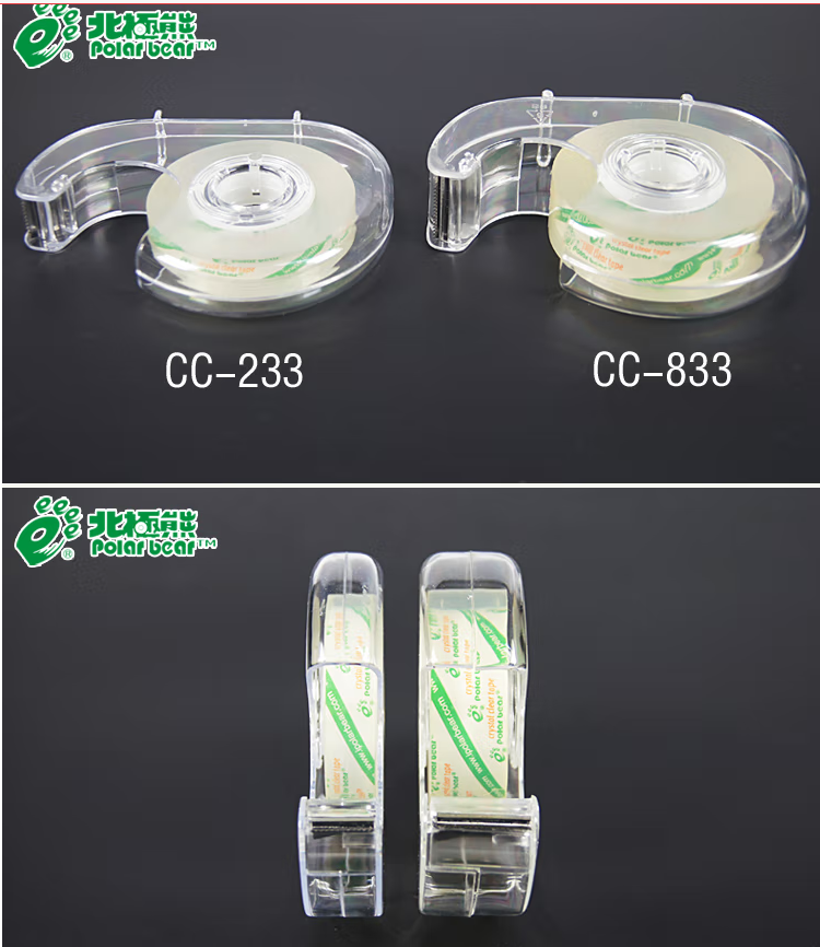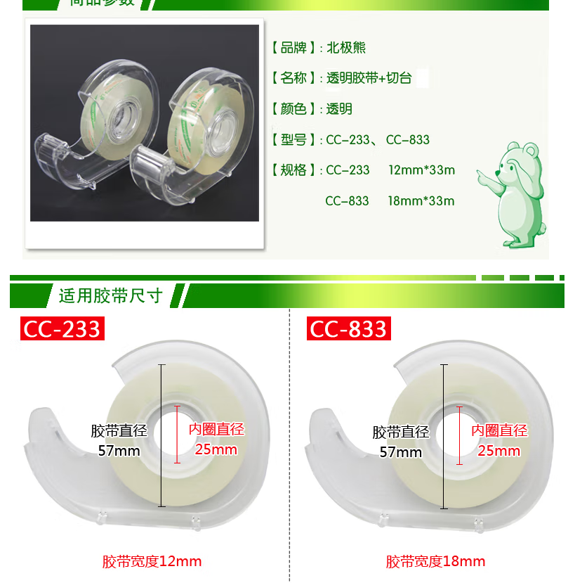 商品名称:北极熊(polar bear) 高粘度透明小胶带+切台 CC-833小号胶布胶条33米切割器胶带座 18mm*33M(CC-833)一个